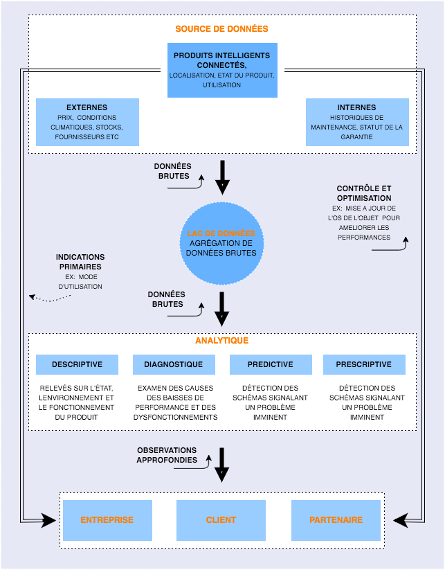Des outils analytiques simples appliqués par chaque produit à ses données, fournissent un premier niveau de repères. Une analytique plus poussée, souvent hors de l’objet connecté, permet des observations plus poussées, à partir des données tirées à la fois des produits et des ressources internes et externes de l’organisation.